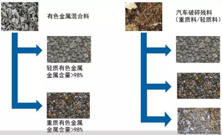 - 通过密度分选得到轻质金属物料和重质金属物料